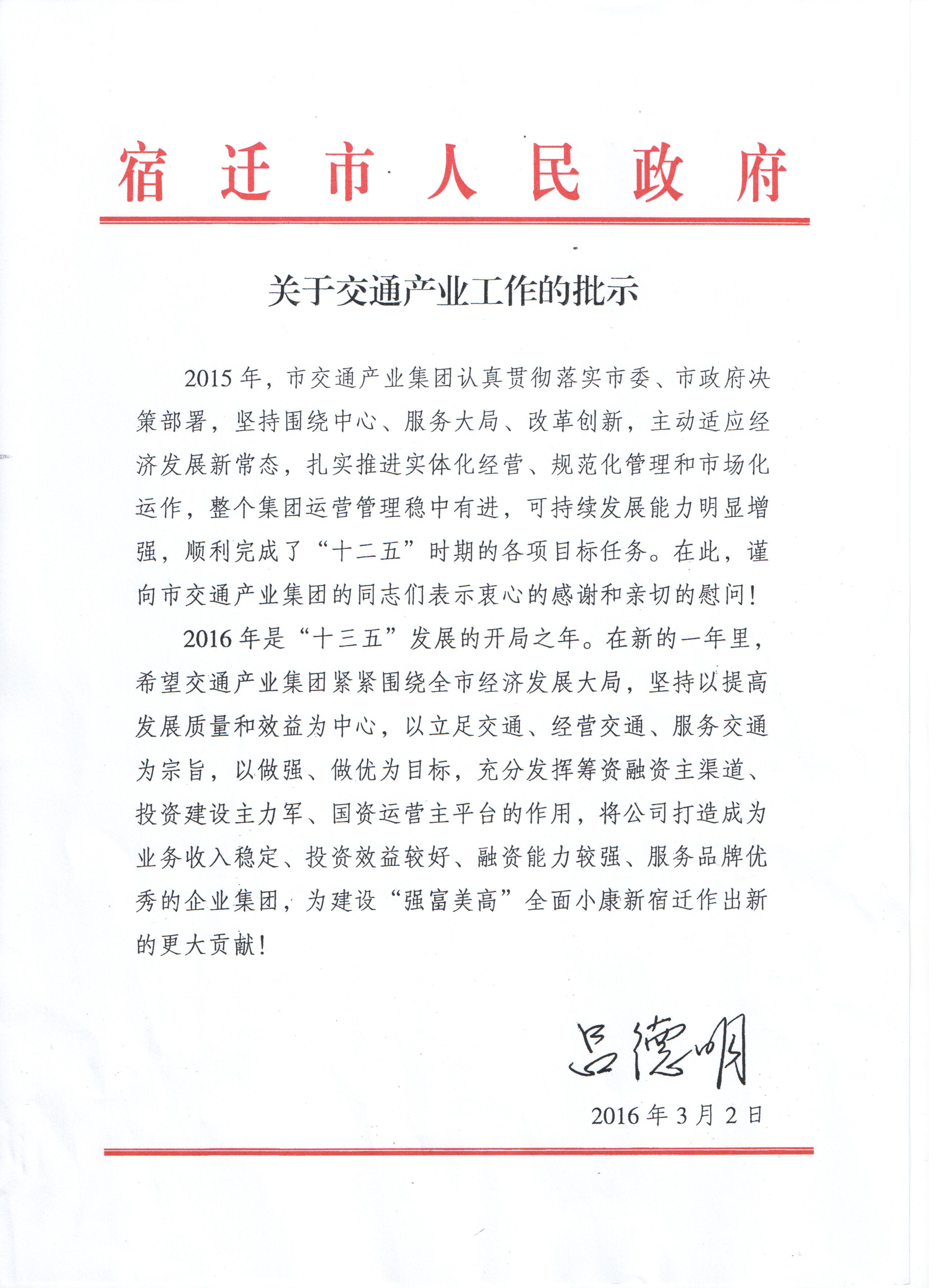 市委常委、常务副市长吕德明关于交通产业工作的批示
