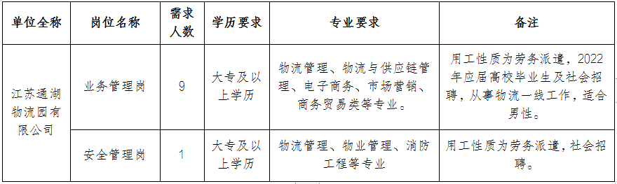 根据生产经营工作需要,江苏通湖物流园有限公司拟招聘一批劳务派遣制人员。现将招聘人员方案如下: