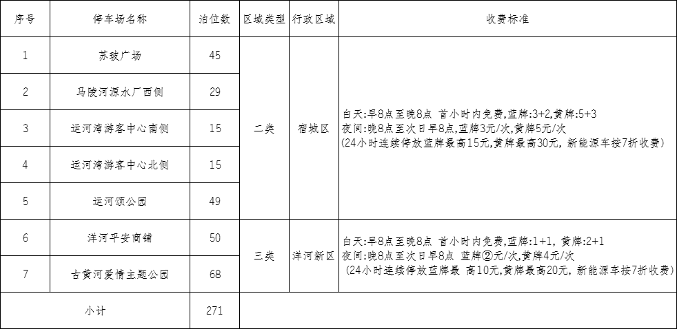 为进一步加强城市停车管理,合理利用停车泊位资源,逐步规范停车行为,保障城市交通安全畅通,有效缓解停车难行车难等突出问题,根据《宿迁机动车停车场管理条例》《宿迁市人民政府第40号会议纪要》等文件,经市停车办批准,拟启动部分公共停车场收费管理工作,具体明细如下: